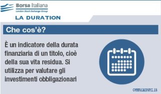 - se un bond è zero-coupon, ossia non distribuisce cedole ma fornisce un pagamento dato dalla differenza tra il prezzo ricevuto a scadenza e quello di emissione (usualmente quindi sotto la pari come per i CTZ italiani), la duration dell’obbligazione corrisponde alla vita a scadenza del titolo (time to maturity);