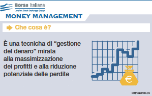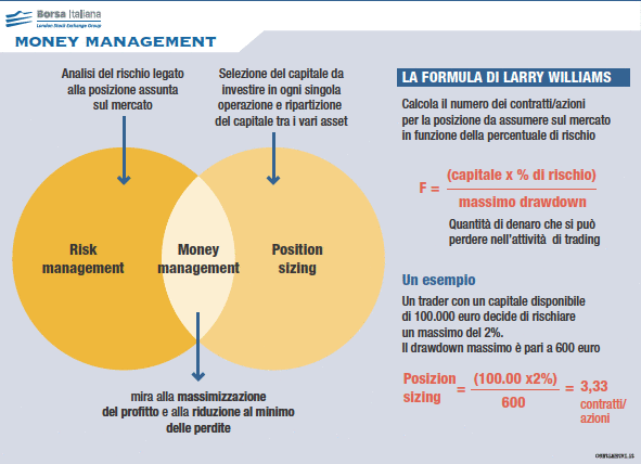 Il money management si compone di due ambiti fondamentali e inscindibili tra loro: risk management ("gestione del rischio") e position sizing. La prima analizza il rischio legato alla posizione assunta sul mercato; la seconda individua il capitale da investire in ogni singola operazione aperta sul mercato e la ripartizione del capitale tra i vari asset di portafoglio.