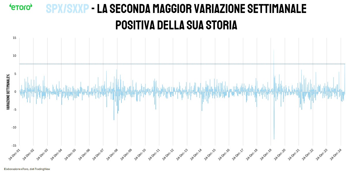 Europa che chiude la scorsa settimana in calo sui mercati azionari: da Milano a Madrid, da Francoforte a Parigi. Il rapporto S&P 500/Stoxx 600 interrompe le 10 settimane consecutive di flessione (record storico) per chiudere in rialzo del 7.77%, ovvero la seconda maggior variazione settimanale positiva della sua storia.