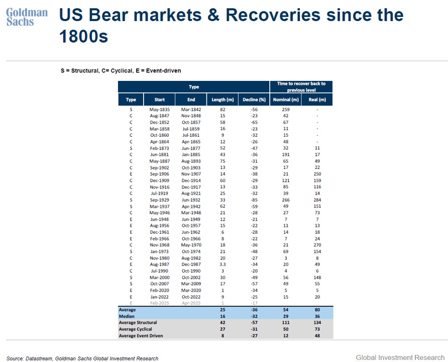 L’innesco è stato chiaro: una nuova guerra commerciale, questa volta alimentata da un ritorno dei dazi USA su scala più ampia. Ma la reazione va oltre il trigger. Goldman Sachs cataloga questa come una crisi “event-driven”, simile al COVID, al flash crash del 1987, al selloff del 2022. Crisi brevi, ma intense: -27% di perdita media, con recupero in circa 12 mesi.