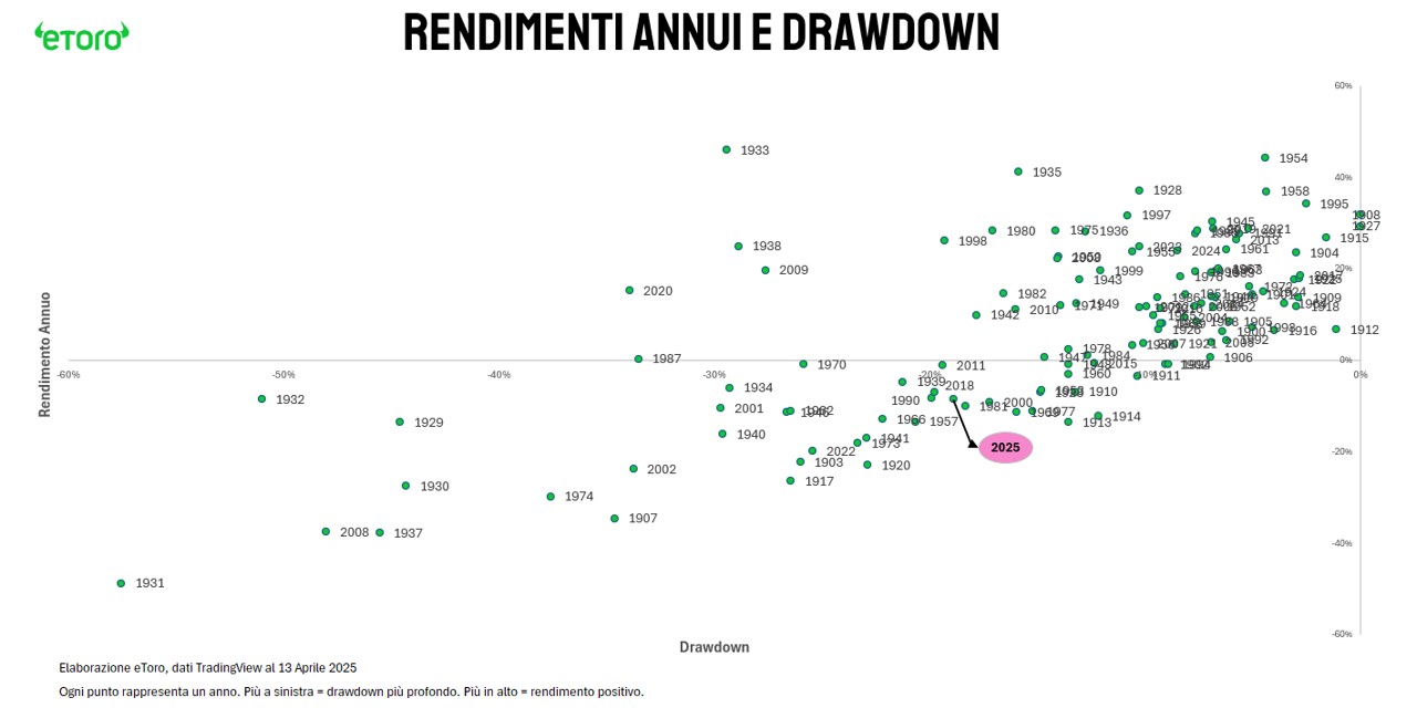 E se guardiamo dal 1900 ad oggi, gli anni di drawdown superiori al 25% non sono rari. Nel 1907, -35%. Nel 1920, -23%. 1929 -45%. 1931 -58%. 1974 -38%. 2008 -48%. 2020 -34%. Il mercato azionario americano ha già sperimentato 29 anni con drawdown superiori al 20%, e 14 con perdite annuali superiori al 15%.