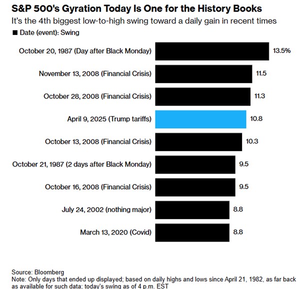 Altro che la settimana scorsa: questo mercoledì è stato il vero Giorno della Liberazione (almeno per Wall Street). Un rimbalzo così non si vedeva da anni. Anzi, da decenni. Il 9 aprile 2025 l’S&P 500 ha registrato una delle escursioni intraday più violente dal 1982: +10,8% dal minimo al massimo. È stata la quarta più ampia nella storia recente, superata solo dalle giornate successive al Black Monday del 1987 e dalla crisi del 2008.