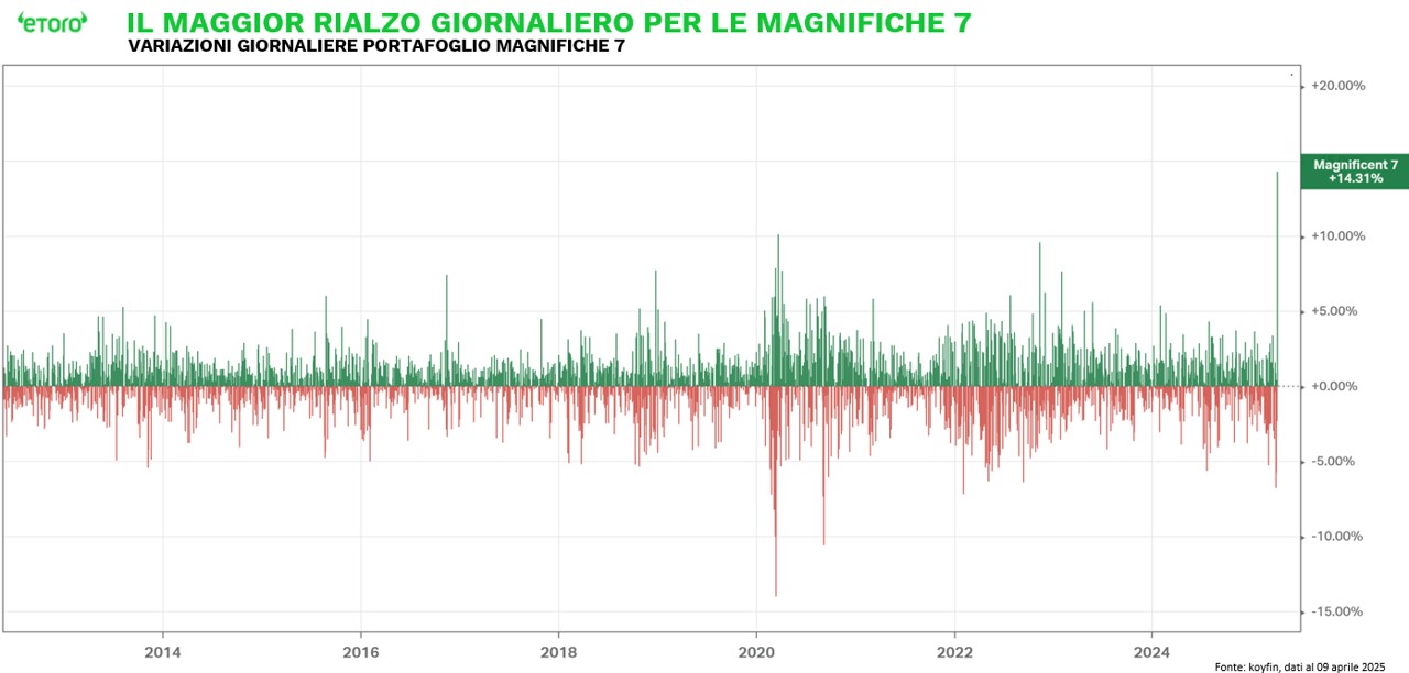A brillare, anche i leader tech. Tesla +22%, Nvidia +19%, Apple +18%. Insieme, le Magnifiche 7 hanno generato ieri 422 punti di contributo all’S&P 500 — pari a circa il 40% del rialzo dell’indice. Un portafoglio equiponderato delle Magnifiche 7, ribilanciato annualmente, ha messo a segno un balzo di oltre il 14% in un solo giorno — il miglior risultato da quando sono disponibili i dati, maggio 2012. Meglio del rimbalzo Covid. Meglio del lancio di ChatGPT. Un rimbalzo storico. Spinto più dal posizionamento che dai fondamentali.