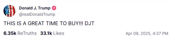 Alle 16:37 (ET), Donald Trump rompe il silenzio su Truth: “THIS IS A GREAT TIME TO BUY!!! DJT”.