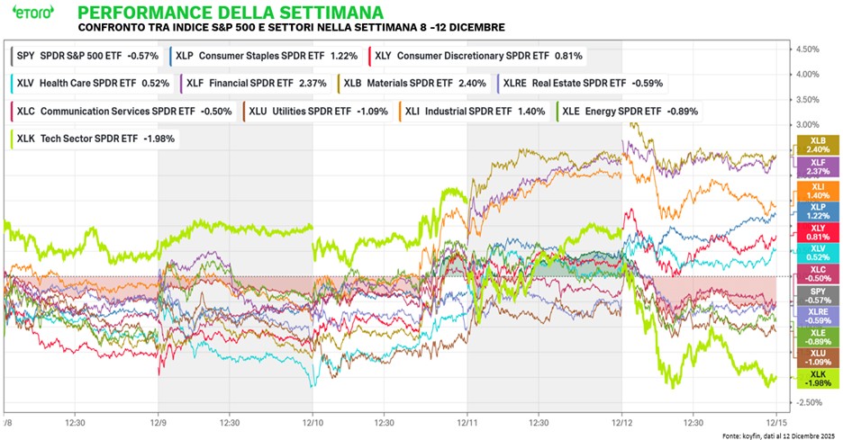 Se ci immergiamo nei dati, la fotografia è impietosa e racconta una storia di rotazione settoriale, ma anche di democrazia finanziaria. Mentre il Tech (XLK) chiude la settimana come fanalino di coda (-1,98%) e il Nasdaq 100 lascia sul terreno l'1,93%, il "tangibile" brilla. Il settore dei Materiali (XLB) svetta con un perentorio +2,40%, seguito dai Finanziari (XLF, +2,37%) e dagli Industriali (XLI, +1,40%).