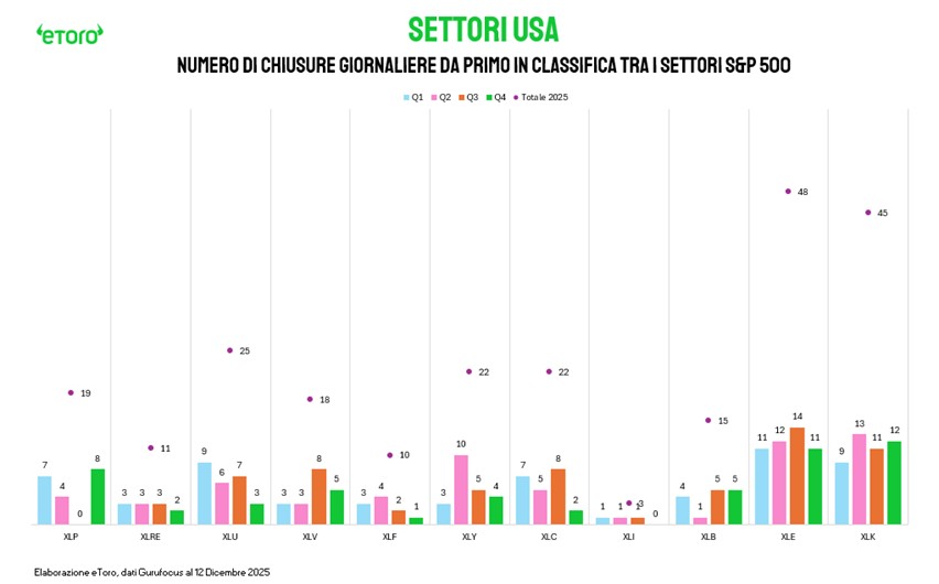 Per capire la violenza psicologica di questo ritracciamento, dobbiamo guardare al curriculum del caduto. Il settore tecnologico non è un settore qualunque: oltre ad essere il peso massimo di Wall Street, con un'incidenza del 34,9%, è il "primo della classe" indiscusso del 2025, con una performance Year-to-Date del +24,17%, superiore a qualsiasi altro comparto. Non solo: nel corso del 2025, il Tech è salito sul gradino più alto del podio (miglior settore di giornata) per ben 45 volte, una dominanza seconda solo all'energia.
