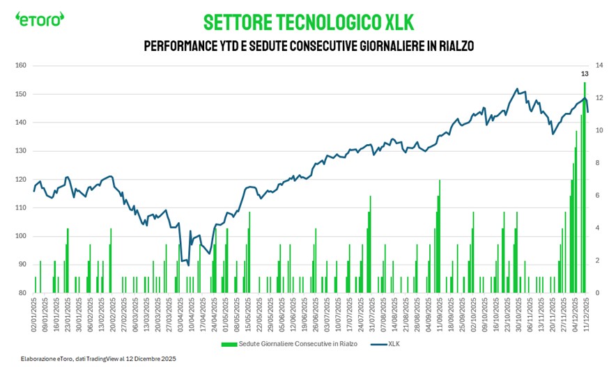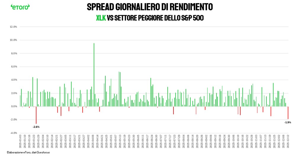 Tuttavia, chi parla di inversione dovrebbe guardare meglio la statistica delle "maglie nere". È vero, l'11 e il 12 dicembre l'XLK è stato il peggior settore di Wall Street, con uno spread di performance rispetto al resto del gruppo che venerdì ha ricordato i livelli di fine gennaio. Ma c'è un dato che funge da paracadute: indossare la "maglia nera" per due sedute consecutive è un evento rarissimo che non si verificava dal 24 febbraio 2025. Ed ancora, nel 2025, l'XLK non ha mai registrato più di 3 sedute consecutive come ultimo della classe. La serie negativa record si ferma a 3 giorni (registrata tra il 23, 24 e 27 gennaio). Oggi siamo a quota 2. Questo ci suggerisce che, statisticamente, l'elastico è già molto teso verso il basso e potremmo essere vicini a un punto di reazione, non a un baratro.
