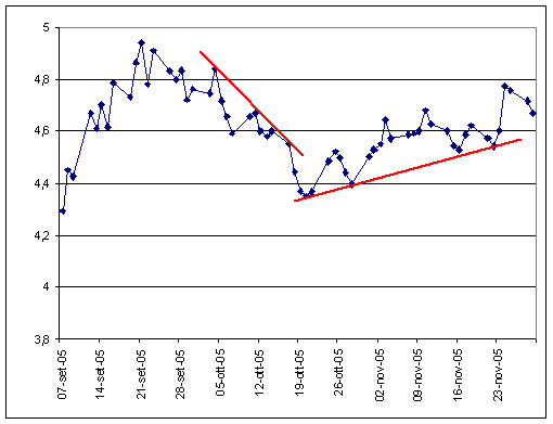 • rialzista, quanto è possibile collegare con una linea retta due o più punti di minimo tra loro crescenti;