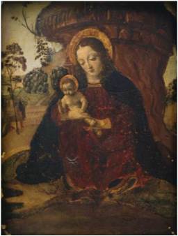 La tavola, proveniente dalla collezione dell’ingegner Luigi Bernasconi ed esposta alla Mostra di Leonardo da Vinci del 1939, è stata attribuita al Maestro della Pala Sforzesca da Pietro Marani. La veste blu della Vergine presenta tracce di decorazioni forse dorate o in rilievo e una stesura di lacca rossa su una base di oro a missione, graffita con un motivo a stelle. La cronologia del Maestro può contare sull’unico punto fermo della Pala Sforzesca di Brera, proveniente dalla chiesa francescana di Sant’Ambrogio ad Nemus, le cui vicende sono state ultimamente chiarite da nuovi ritrovamenti di documenti, dai quali si evince che l’opera nel gennaio nel 1495 non era ancora pronta, e che lo dovette essere nella seconda metà dell’anno, dopo l’investitura ducale di Ludovico e la nascita del secondogenito Francesco, che vi è rappresentato con la famiglia ai piedi della Vergine e dei Dottori della Chiesa.