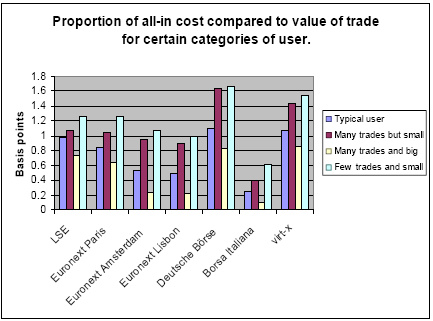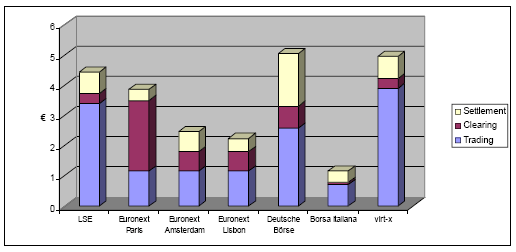 Risulta inoltre che, anche considerati singolarmente, i costi di trading, clearing e settlement del Gruppo Borsa Italiana sono più bassi di quelli dei competitor, indipendentemente dai diversi modelli di business adottati.