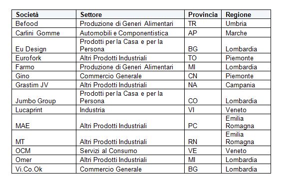 Le nuove società che entrano oggi a far parte del network ELITE appartengono a diversi settori di eccellenza dell’economia italiana, dall’alimentare all’automotive, dall’industria al design. Le 14 aziende provengono da 7 diverse regioni, con un fatturato aggregato pari a 640 milioni di euro e un totale di 1.800 dipendenti.