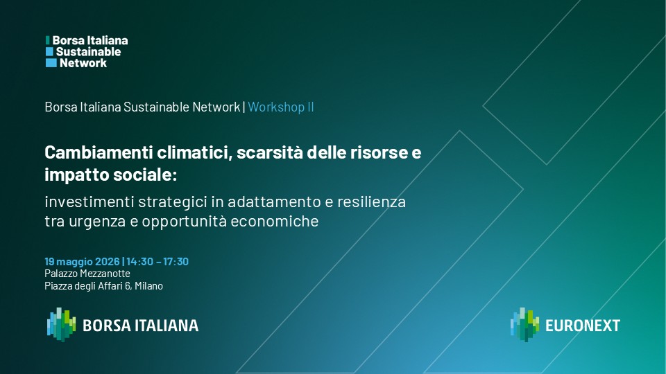 Il prossimo appuntamento del Sustainable Network di Borsa Italiana esplora le interconnessioni tra cambiamenti climatici, scarsità delle risorse e impatto sociale, con un focus sul ruolo strategico degli investimenti nell’adattamento e nella resilienza.