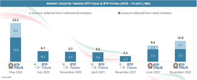 Considering the complex market momentum – driven by increasing inflation, rates hikes by central authorities, such as the Federal Reserve or the European Central Bank, prolongation of the effect of the Ukraine-Russia conflict – the interest of retail investors towards safer and less volatile assets such as bonds has increased rapidly. The hanger of Italian savers to invest in debt instruments has become apparent in the context of the placement of the latest BTP Italia in November 2022: the Ministry of Economy and Finance has collected ca. €7.3 billion from over 255.700 retail investors, denoting massive interest toward this type of instrument. Since 2020, the Italian Government has collected ca. €50 billion from retail investors out of €64 billion, through both BTP Italia and BTP Futura. However, Government-issued instruments represent only a portion, although meaningful, of the Italian debt capital market, and yet with a relatively low yield. Expect for governments’ bonds, retail investors do not currently dispose of a wide range of investment options to choose from.