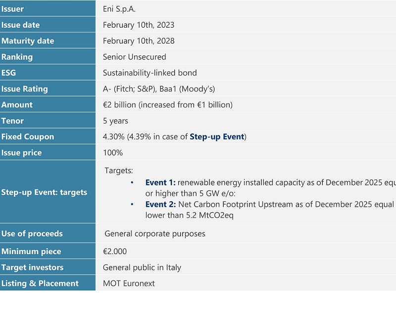 The €2 billion ENI issuance has re-opened a huge portion of the Italian debt capital markets, represented by the general public, strongly supported by the increasing popularity of ESG instruments.