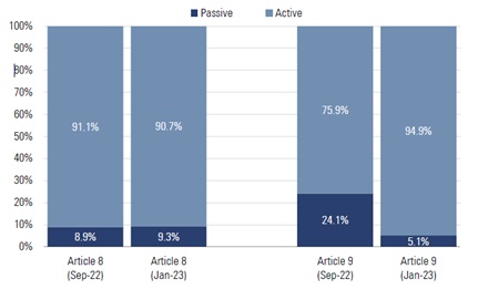 Following the reclassification of sizable index funds and exchange-traded funds tracking EU Climate benchmarks (Paris-aligned and climate-transition benchmarks), the market share of Article 9 passive funds shrunk from 24% to 5%.