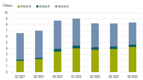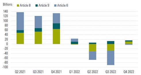 Dopo tre trimestri di deflussi, i fondi Articolo 8 sono tornati in attivo, raccogliendo 10,7 miliardi di euro di nuovi capitali netti nell'ultimo trimestre del 2022. I fondi Articolo 9 hanno registrato gli afflussi più bassi di sempre, 5,1 miliardi, in parte a causa della recente ondata di declassamenti.