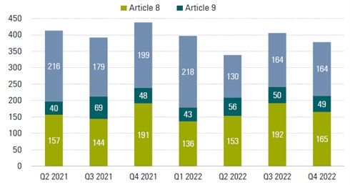 Il lancio di nuovi prodotti è rimasto forte. Stimiamo che 165 fondi Articolo 8 e 49 fondi Articolo 9 abbiano debuttato negli ultimi tre mesi del 2022. È probabile che questo numero verrà rivisto al rialzo in futuro.