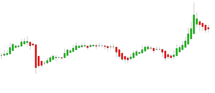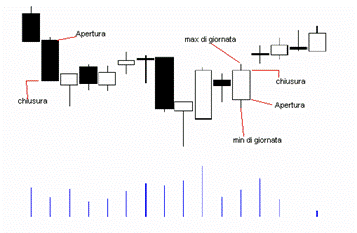 Il grafico a candele è molto simile a quello a barre e fornisce lo stesso numero di dati, cambia solo la presentazione. Anche in questo caso vengono visualizzate le informazioni relative a massimo, minimo, apertura e chiusura dello strumento analizzato, nell'orizzonte temporale prescelto, con la differenza che la "candela" è costituita da un vero e proprio "corpo" (o “real body” secondo la terminologia anglosassone ufficiale) che delimita l'intervallo tra apertura e chiusura. Il corpo viene disegnato in nero o lasciato bianco a seconda che l'apertura nell'unità temporale considerata sia stata superiore (nero) o inferiore (bianco) alla chiusura. Il massimo e il minimo vengono poi visualizzati con segmenti, chiamati “shadow" (ombre), posizionati rispettivamente sopra e sotto il corpo della candela.