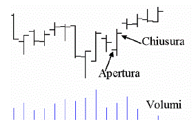 Il grafico a barre evidenzia tutti e quattro i prezzi per ogni unità di tempo: apertura, chiusura, massimo e minimo. L'apertura e la chiusura vengono indicate con due trattini orizzontali posti rispettivamente a sinistra e a destra della barra verticale, la quale a sua volta esprime l'escursione di prezzo. Nel caso della figura in esempio, l’istogramma in basso rappresenta l'andamento dei volumi: abbiamo quindi tutte le informazioni necessarie per le nostre valutazioni.