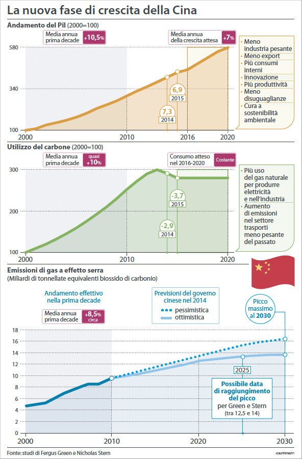 Green e Stern puntano l'attenzione soprattutto sul tema delle emissioni di gas serra. L'utilizzo del carbone (principale responsabile della crescita delle emissioni) nella produzione di elettricità e nell'industria in Cina, dopo essere cresciuto a un ritmo vicino al 10% annuo nella prima decade del secolo, ha raggiunto un picco per poi iniziare a decadere: -2,9% nel 2014 e -3,7% nel 2015. Nei prossimi cinque anni si prevede che il consumo di carbone si mantenga costante. Di converso, l'utilizzo di gas naturale è stimato in rapida crescita nella produzione di elettricità e nell'industria nei prossimi cinque/dieci anni. Il consumo di carburante e le emissioni di gas serra nel settore trasporti sono attesi in crescita per tutta la prossima decade almeno, ma in misura meno accentuata di quanto stimato in molti studi condotti nel recente passato.
