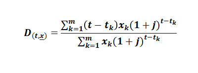 Fissando poi j come tasso di valutazione e inserendo un fattore di attualizzazione in un regime a interessi composti si giunge alla formula della durata media finanziaria descritta sopra.