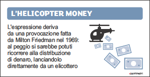 L’espressione “helicopter money” deriva da una provocazione fatta dall’economista Milton Friedman nel 1969 mentre spiegava quali fossero i meccanismi di trasmissione di denaro dallo Stato all’economia reale. Secondo Friedman, se tutte le strategie ortodosse di politica monetaria non avessero funzionato, al peggio si sarebbe potuti ricorrere alla distribuzione di denaro lanciandolo direttamente da un elicottero in modo da aumentare l’inflazione: