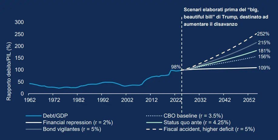 L’esplosione del debito pubblico USA – ormai oltre i 36.000 miliardi di dollari e in costante aumento – è tornata al centro dell’attenzione dei mercati obbligazionari, preoccupati per la capacità del governo di onorare i propri impegni nel lungo periodo. Le simulazioni elaborate prima dell’annuncio del “grande, bellissimo disegno di legge” di Trump indicavano uno scenario estremo – il cosiddetto “incidente fiscale” – in cui il rapporto debito/PIL potrebbe raggiungere il 252%, rafforzando le preoccupazioni legate all’aumento dei rendimenti e al calo dell’interesse verso gli asset statunitensi.