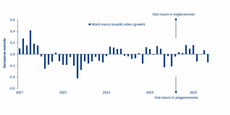 1) Il nostro indice proprietario Macro Breadth Growth Index misura l’andamento di 354 dati macroeconomici globali, regionali e nazionali su base mensile. La variazione mensile dell’indice ha un fattore di scala da -1 a 1, con il valore di 1 (-1) che implica un incremento (decremento) di tutti gli indicatori sottostanti. Focalizzandosi sulla direzione anziché sulla grandezza della variazione, gli indici consentono la valutazione dell’ampiezza delle tendenze macro sottostanti e sono meno inclini a revisioni storiche dei dati sottostanti. Fonte: Allianz Global Investors Global Economics& Strategy, Bloomberg, Refinitiv (dati al 31 maggio 2025).