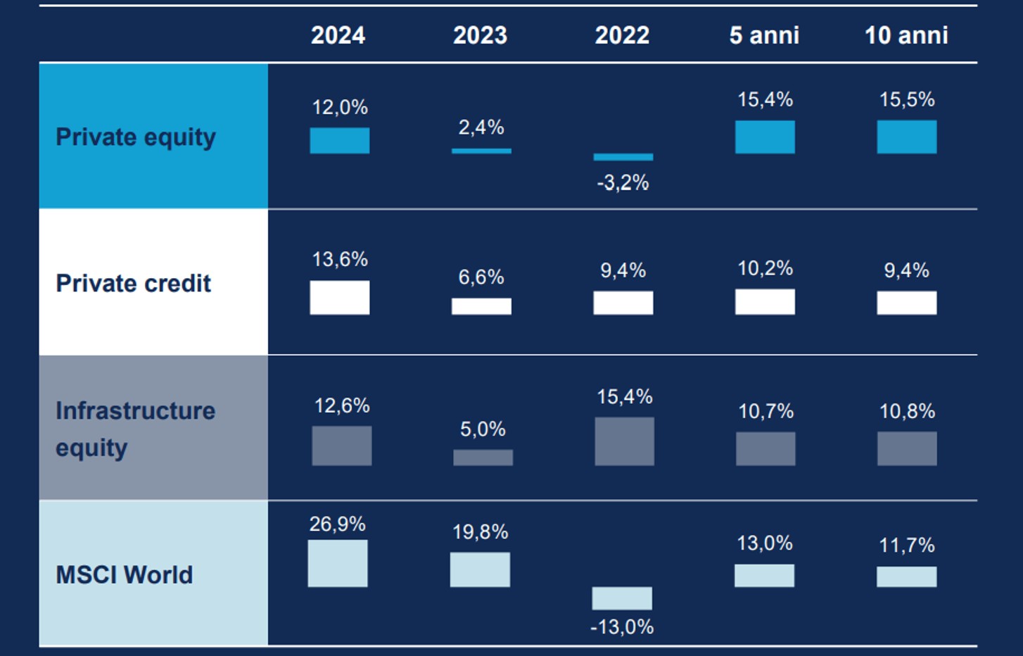 Fonte: Allianz Global Investors, MSCI Private Capital e Bloomberg: IRR netti aggregati per tutte le annate nei mercati privati e rendimenti totali per l’azionario, tutti al 31 dicembre 2024, in EUR. Rappresentazione a mero scopo illustrativo, senza garanzia di risultati attesi né indicazione di una futura allocazione. I rendimenti passati non sono indicativi di quelli futuri.