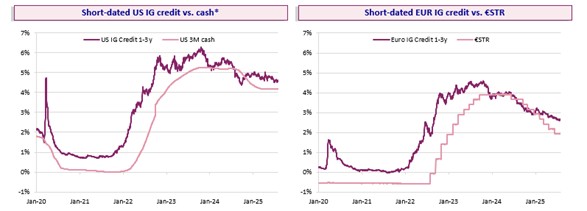 Per illustrare questa tendenza, confrontiamo il rendimento del credito a breve duration con la liquidità. Nel grafico a sinistra possiamo vedere il credito IG USA (1-3 anni) versus la liquidità statunitense e in quello di destra il credito IG in euro (1-3 anni) versus il tasso €STR.