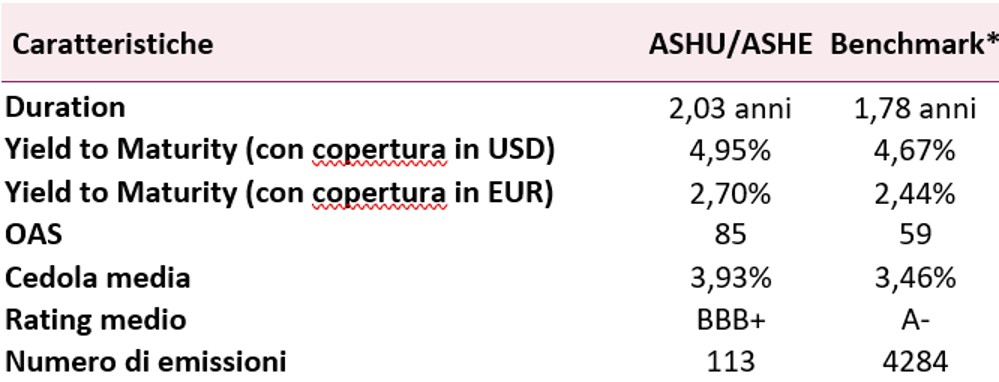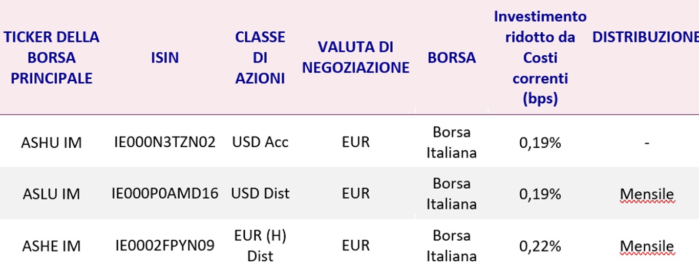 - ASHU è un ETF attivo incentrato sul credito investment grade globale che utilizza un esclusivo approccio Buy & Maintain con l’obiettivo di generare reddito, combinando valore e innovazione nel mercato degli ETF OICVM.