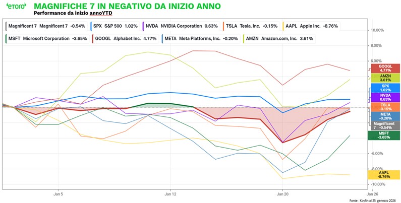 In questo contesto, il mercato sta mettendo alla prova l’America su più fronti contemporaneamente. Il primo è quello dell’AI e del Big Tech. I conti di Meta, Microsoft, Amazon e Apple arrivano in un momento in cui la tolleranza degli investitori verso promesse future si è drasticamente ridotta. Qualsiasi segnale di incertezza sulla monetizzazione dell’AI o sulla sostenibilità di un capex tecnologico sempre più aggressivo rischia di accelerare il disinvestimento dal tech statunitense, con effetti immediati sull’equity e sul dollaro. Le Magnifiche 7 sono già in territorio negativo da inizio anno, e questo rende ogni conference call un test di credibilità, non di narrativa.