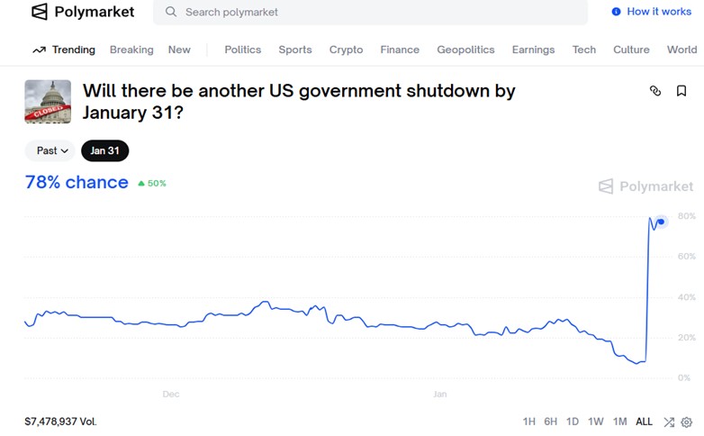 Il secondo fronte è politico e istituzionale. Negli Stati Uniti le tensioni interne si intensificano, con senatori democratici pronti a bloccare il funding bill per il Department of Homeland Security su riforme e agenzie come ICE, dopo una sparatoria fatale che ha coinvolto un agente della Border Patrol. Con l’avvicinarsi delle scadenze di finanziamento, cresce il rischio di un partial government shutdown, che i mercati prezzano con una probabilità del 77% (dati polymarket). A questo si aggiungono altri fattori di instabilità: il rischio di un’escalation con l’Iran, l’indagine del DOJ sul Fed Chair Powell, l’ipotesi che il CIO di BlackRock possa diventare il prossimo Chair della Fed, e Trump che torna a invocare assegni di stimolo da 2.000 dollari e tassi all’1%. Il messaggio che arriva ai mercati è quello di un quadro politico sempre più rumoroso e sempre meno prevedibile.