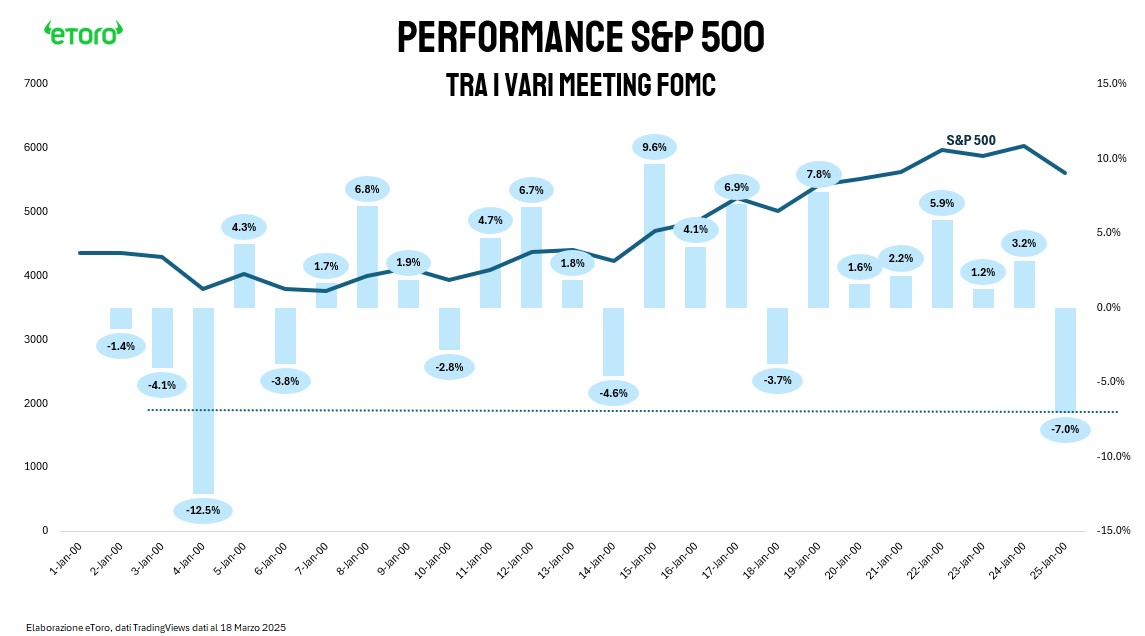 A conferma della tensione che si respira sui mercati, dallo scorso meeting FOMC del 29 gennaio 2025, l’S&P 500 ha ceduto il 7%, un crollo tra due riunioni della banca centrale che non si vedeva dal 15 giugno 2022, quando l’indice perse il 12,5% in pieno avvio del ciclo restrittivo sui tassi d’interesse. Un segnale chiaro: i mercati non stanno semplicemente osservando le mosse della Fed, ma stanno già prezzando l’incertezza. Se Powell vuole riportare stabilità, dovrà muoversi con estrema precisione, perché la partita – ancora una volta – si gioca sulle aspettative.