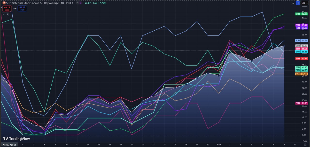 All’interno dello S&P 500, sono solo alcuni comparti a trainare il movimento. La tecnologia (SKFI) svetta con l’82,6% dei titoli al di sopra della propria media mobile a 50 giorni, e ha segnato un impressionante +850% in termini di partecipazione tecnica dal 2 aprile. Seguono i finanziari (SFFI) al 73,9% e gli industriali (SIFI) al 73,1%, a indicare una rinnovata fiducia nei confronti dei comparti più ciclici. Utilities (SUFI) si attestano al 64,5%, ma in flessione del -26% dallo stesso riferimento, sintomo di un parziale abbandono della difensiva. L’indice aggregato dell’S&P 500 (S5FI) si colloca al 60,8%. In coda troviamo l’energia (SEFI), con solo il 21,7% dei titoli sopra la media mobile e un calo del -73% dal 2 aprile, penalizzata dalla caduta del prezzo del petrolio. Anche i consumi primari (SPFI, 44,7%) registrano un forte arretramento (-41%). La sanità (SVFI, 41,7%) resta sotto pressione, complice il ritorno di incertezza normativa su un settore che era stato temporaneamente escluso dalle misure tariffarie.