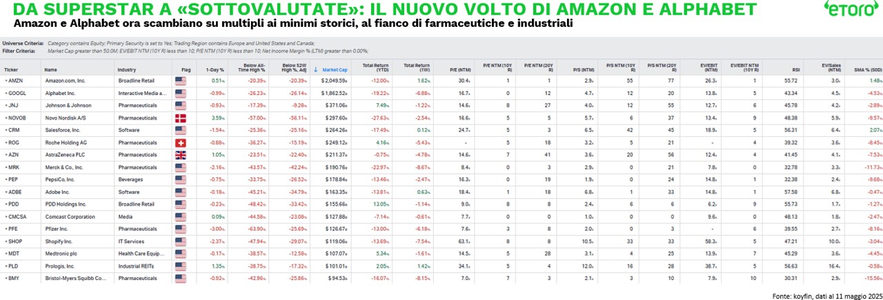Amazon si trova in una posizione simile: 30,4 volte gli utili futuri, ma anche in questo caso su P/E e EV/EBIT storicamente bassi (entrambi al 1° percentile decennale), e un P/S forward di 2,9x, più vicino ai livelli di un distributore tradizionale che di una piattaforma globale. Il titolo ha da poco superato la media mobile a 50 giorni e l’RSI è tornato sopra 55, ma anche qui il mercato sembra attendere un nuovo catalizzatore.