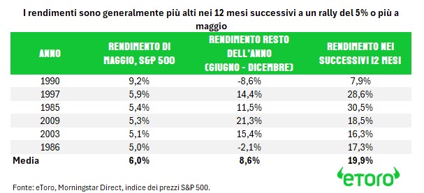 Dal 1980 a oggi, ci sono stati solo sei casi in cui l’S&P 500 è salito di oltre il 5% a maggio. In tutti e sei, i 12 mesi successivi si sono chiusi con performance positive. Non è legge di mercato, ma il pattern non passa inosservato: quando il momentum si accende in primavera, raramente si spegne d’estate.