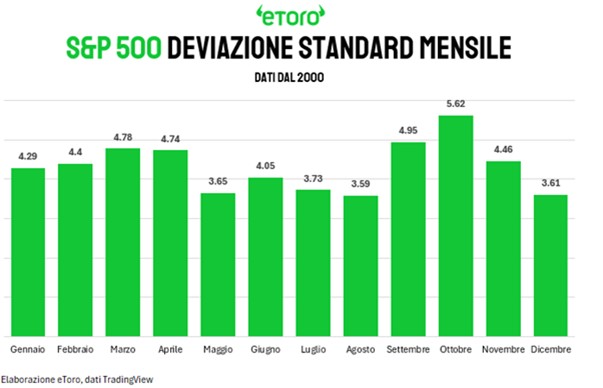 Si chiude un altro mese per i mercati finanziari e si entra nell’ultimo tratto dell’anno, il periodo in cui il rumore tende ad attenuarsi e lascia spazio a una dinamica più ordinata. I numeri dello S&P 500 parlano con chiarezza. Dal 2000 dicembre è uno dei mesi più stabili del calendario, secondo solo ad agosto. È la fase in cui la deviazione standard scende, le oscillazioni si comprimono e il mercato ritrova un equilibrio che nei mesi più turbolenti è difficile intercettare.