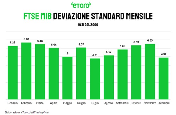 Uno sguardo al FTSE MIB restituisce un messaggio simile, anche se con una fisionomia diversa. Dicembre è uno dei mesi più composti anche per l’indice italiano, superato soltanto da luglio.