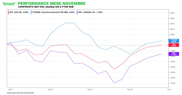 Novembre lo ha dimostrato con chiarezza. Un mercato attraversato da incertezze, con lo S&P 500 e il Nasdaq 100 in calo nella seconda metà del mese a circa il 4,4% e il 7% oppure con un FTSE MIB capace di toccare un +4,2% il 12 novembre prima di appiattirsi. Nonostante tutto, le chiusure finali sono rimaste immobili. Negli Stati Uniti lo S&P 500 avanza dello 0,13%, estendendo a sette i mesi consecutivi di rialzo, pur senza registrare nuovi massimi nel mese, ancora fermi a quota 36 da inizio anno. Dinamica simile per il Nasdaq 100, con l’ultimo massimo storico datato 29 ottobre 2025 ma con una chiusura mensile in calo dell’1,64% che interrompe una striscia di sette mesi consecutivi di rialzi.