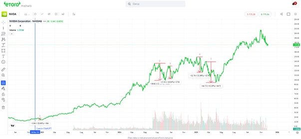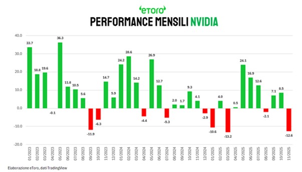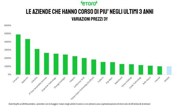 Restando in tema AI, è significativo ricordare che proprio ieri ChatGPT ha compiuto tre anni. Dal 30 novembre 2022 Nvidia è cresciuta del 1033%, un’ascesa che ha attraversato comunque cinque bear market (correzioni di almeno il 20%) ma che non ha scalfito la forza delle tendenze strutturali.