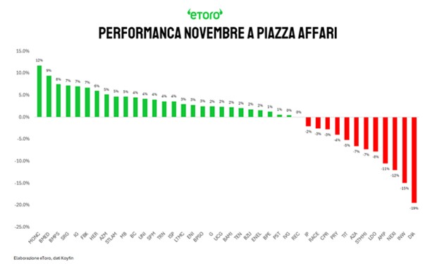 Sul fronte italiano Moncler chiude il mese come miglior performer con un +12%, seguita dai nomi del settore bancario come Banca Mediolanum e Monte dei Paschi di Siena. 28 titoli chiudono novembre in positivo, mentre dodici arretrano, guidati da Diasorin (-19%), Inwit (-15%) e da Nexi a -12%. Tra le vendite compaiono pesi massimi come Ferrari -3%, Prysmian -4%, Leonardo -8% e Banco BPM -2%. I due titoli che insieme pesano il 28,4% dell’intero indice, Intesa e UniCredit, chiudono praticamente immobili, rispettivamente a +0,18% e +0,09%.