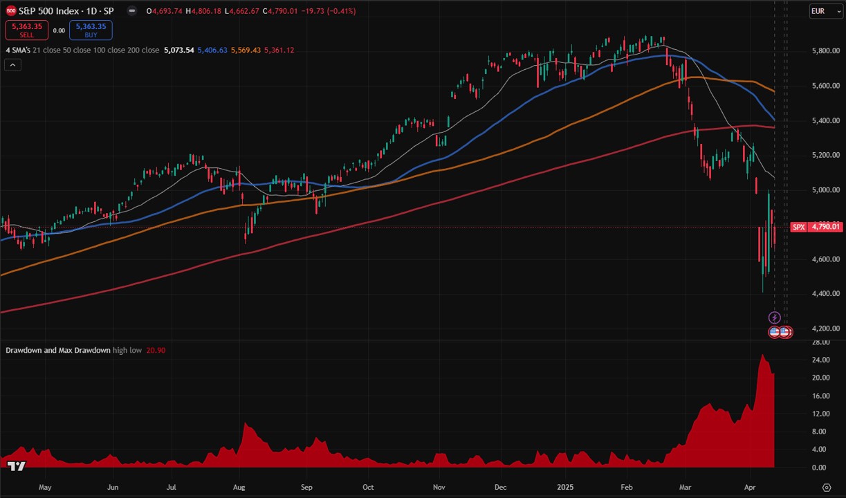 I rendimenti decennali sono saliti per cinque sedute consecutive, chiudendo la settimana con un +12,4% – il rialzo più marcato dal 2022. Nel frattempo, il dollaro ha continuato a indebolirsi: quarta seduta negativa, terza settimana consecutiva in calo, terzo mese di fila. Una combinazione che, per un investitore europeo, ha un significato chiaro: anche con lo S&P 500 in ripresa, Wall Street resta in recessione. Perché, al netto dell’effetto cambio, l’indice è ancora sotto del 20.9% dai massimi storici.