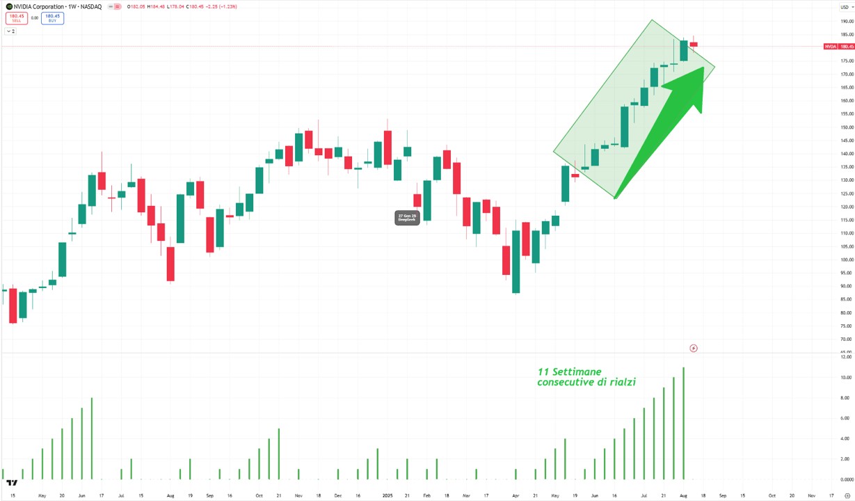 Eppure, dentro questo entusiasmo generalizzato, brilla un’assenza. Proprio il gigante che ha incarnato la corsa all’intelligenza artificiale, il colosso da oltre 4 trilioni di dollari che da solo ha garantito il 22% del rialzo del Nasdaq 100 dall’inizio dell’anno, ha scelto di fermarsi. Nvidia, dopo 11 settimane consecutive di rialzi - e nel mezzo 20 nuovi massimi storici - ha chiuso in flessione. Non è un refuso: dal 27 maggio al 15 agosto il titolo ha aggiunto 1,2 trilioni di dollari di capitalizzazione, più dell’intero FTSE MIB messo insieme.