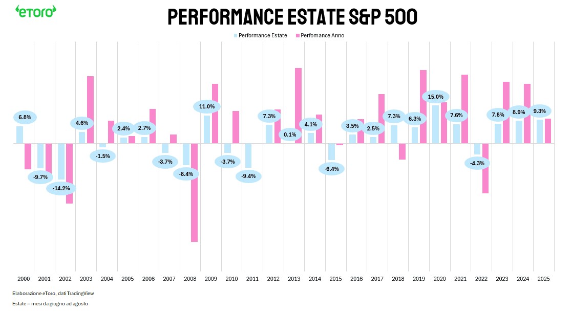 La stagionalità resta un riferimento forte. Dal 2000 la performance media estiva è stata di +1,8% (mediana +3,1%), con 17 estati su 26 in territorio positivo. Quando l’estate chiude in verde, l’anno tende a confermare con una correlazione attorno allo 0,65: in media, un’estate positiva porta a un +15% annuo. Al contrario, quando giugno-agosto si colora di rosso, la media annua scivola a -7,7%. Gli estremi lo dimostrano: estati molto negative (≤ -5%) hanno sempre accompagnato anni neri (2001, 2002, 2008, 2011, 2015). Quelle molto positive (≥ +7%) hanno quasi sempre anticipato rally robusti: 2009, 2012, 2020, 2021, 2023 e 2024. Ma le medie vanno lette con cautela: basta ricordare il 2018, quando l’estate brillante non bastò a fermare la correzione autunnale innescata dalla Fed e dalla guerra commerciale. È qui che la storia stagionale incontra la realtà macro.