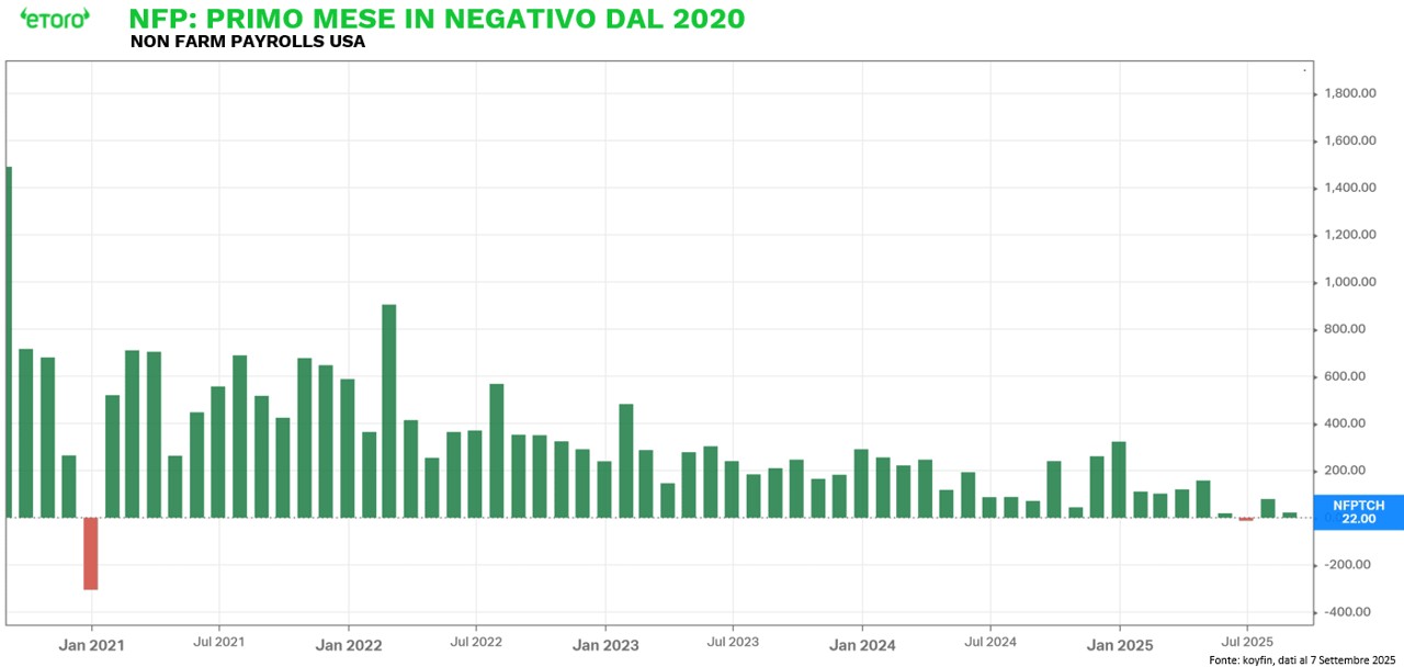 Il 2025, con un anno a +10,2% YTD, sembra ancora allineato allo schema, ma la prima settimana di settembre ha riportato i mercati alla realtà. La realtà macro, questa volta, è arrivata con il dato più atteso della settimana: il mercato del lavoro americano. Ad agosto i Non-Farm Payrolls hanno segnato appena 22.000 nuovi posti, contro i 75.000 attesi. Giugno è stato rivisto addirittura a -13.000, il primo mese negativo dal 2020. Il tasso di disoccupazione è salito al 4,3%, massimo dell’anno.
