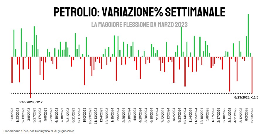 Il secondo segnale viene dall’energia. Il petrolio ha chiuso la peggiore settimana da oltre un anno: -11% il bilancio settimanale del WTI, con prezzi tornati a 65 dollari al barile. La reazione iniziale all’attacco israeliano era stata rapida, ma altrettanto veloce è stata l’inversione. Il rischio geopolitico è evaporato in pochi giorni. Un “premio” svanito più per assenza di danni che per presenza di pace. Ma tanto basta ai mercati per vedere il bicchiere mezzo pieno: meno rischio, meno inflazione, più margine per la Fed.