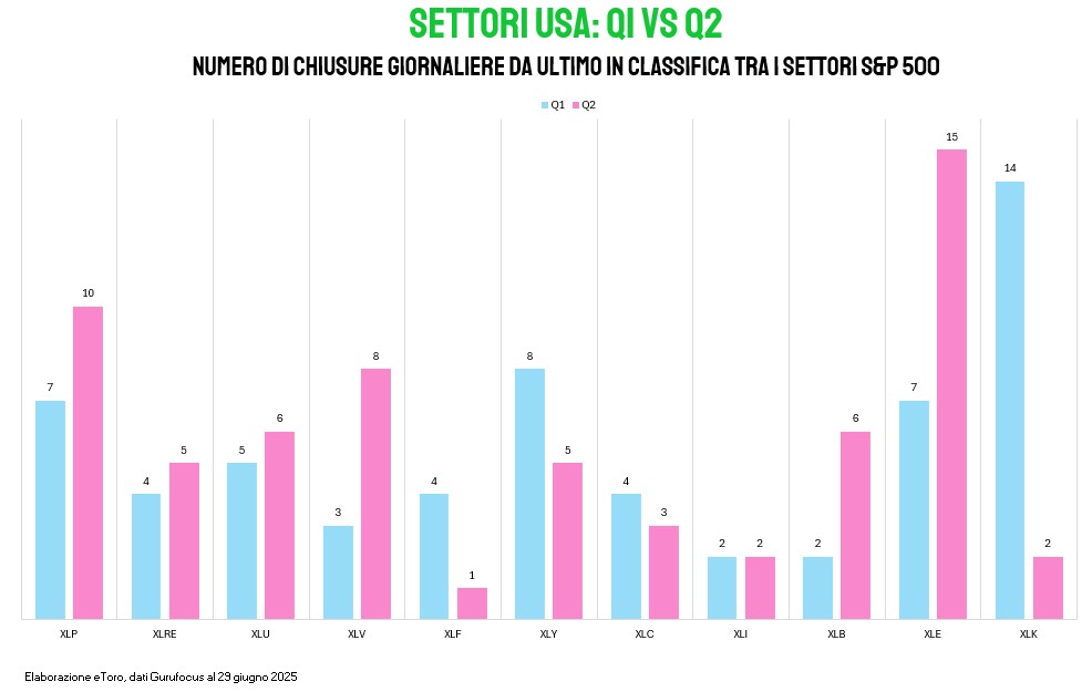 Il quarto asse del rally è quello più classico: la forza relativa del tech. Da grande assente del primo trimestre, ha cambiato pelle nel secondo. Le sedute da maglia nera sul principale listino americano (14 volte nei primi tre mesi dell’anno, il dato peggiore tra tutti gli undici settori) si sono ridotte a due soltanto. Non è più soltanto la narrativa sull’intelligenza artificiale. È l’effetto compounding tra utili resilienti, capitalizzazione crescente e ricerca costante di duration. Da aprile l’S&P 500 è salito del 24%, ma il Nasdaq ha fatto meglio. Ancora una volta.