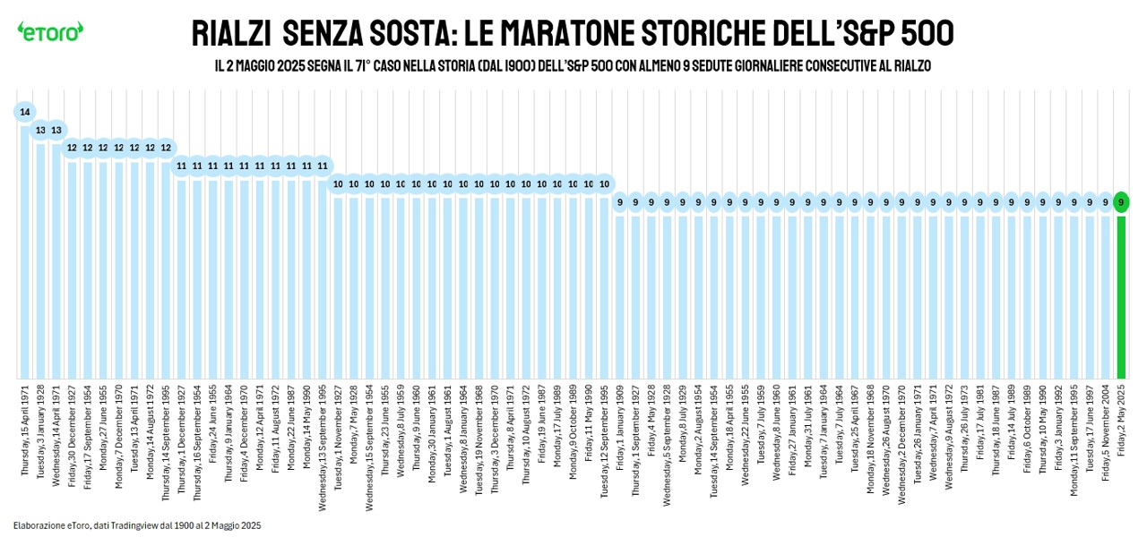 In un contesto macro ancora fragile ma non recessivo, i mercati sembrano tirare un sospiro di sollievo. L’S&P 500 ha appena chiuso nove sedute giornaliere consecutive al rialzo, con un guadagno totale del +10,2%: una combinazione rara e potente. Dal 1900, una striscia simile (o migliore) si è verificata solo 71 volte, e in meno di 10 casi il rimbalzo ha superato il +10%. L’ultima volta che è accaduto fu nel gennaio 1992 (+9,6%). In altre parole: è la serie più intensa degli ultimi 30 anni, anche se lontana dal record assoluto del +45% toccato nel 1909.