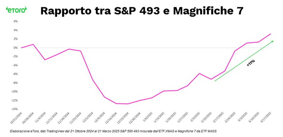 In parallelo, è proseguita una dinamica che era già in corso da inizio anno: la progressiva rotazione dalle Magnifiche 7, e dai tre settori che le ospitano – Information Technology, Consumer Discretionary e Communication Services – verso il resto del listino. Il rapporto tra S&P 493 e Magnifiche 7 (XMAG/MAGS) mostra un'inversione già visibile da metà dicembre, ma è stata intorno alla metà di febbraio, con il picco dell’indice, che la divergenza si è fatta più marcata.